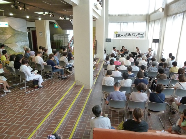 高度な技術と息のあったハイクオリティーな演奏に、会場から和度々割れんばかりの拍手が。小さなお子さんも、お行儀よくジブリ音楽を聴いていました。 しかし、途中からお日様がものすごい笑顔で顔を出し…遮光パネルを立てなかった窓際は灼熱地獄に。冷房を入れましたが、途中からでは効果も少なく。アンケートでも「暑かった」「演奏者に気の毒」との意見を頂戴しました(苦)。 ロビーという場所を、本来の用途にはない音楽会に利用するということの難しさを度々実感しますが、それもまた、ロビーという場所を選択した宿命なのでしょう。