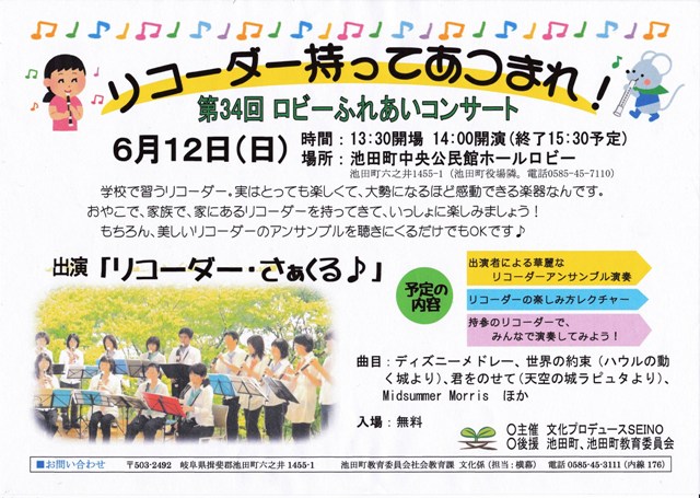 5月17日、定例会を開催しました。 ロビーふれあいコンサートは予定5回の日程が全て決まりました。 その上、かつて出演頂いたグループから熱烈な申し出を頂き、再演をお願いする事になりました。「池田町でのコンサートはお客様もあたたかく、とても楽しかったので」と、会としてはこの上なくうれしいお話しでした。 また、リコーダーのレクチャー・来場者との合奏を取り入れた6月のロビコンでは、ある学校から「池田のポスターを見た。うちでもできないか」と、出演者に話があったそうで、こちらも思わぬ波及効果でうれしいことです。