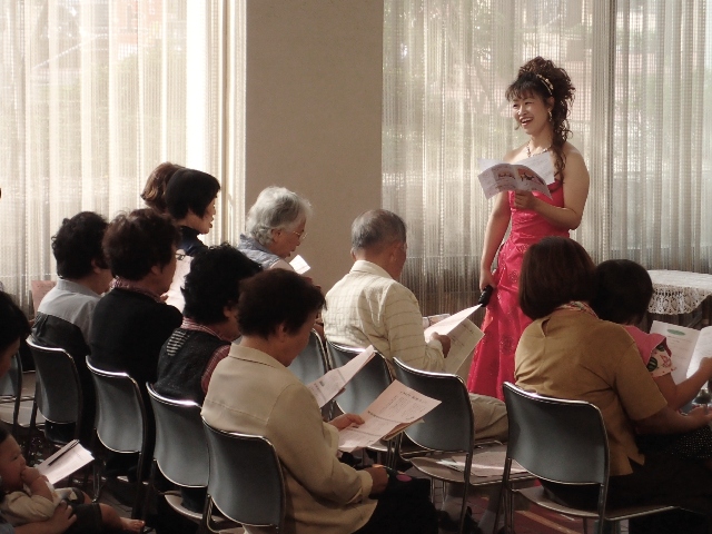 みんなで一緒に歌うコーナーでは、日下部さんは皆と会話をするように客席をまわりながら歌い、「里の秋」や「見上げてごらん夜の星を」など、とても親近感のわく暖かい雰囲気の中で合唱しました。