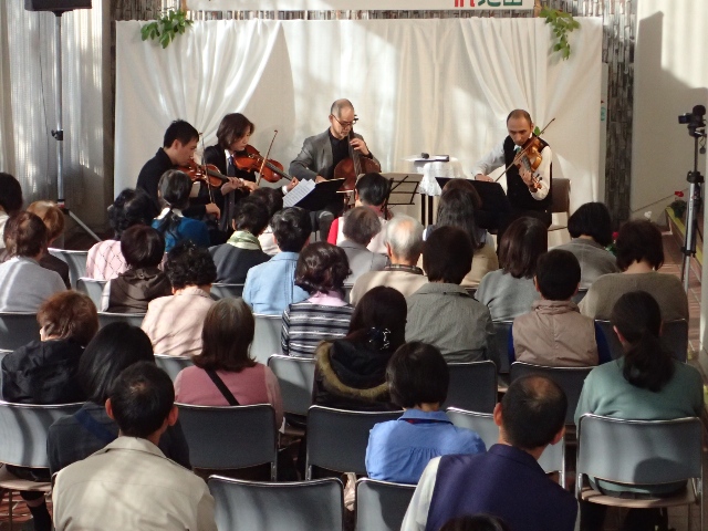 秋晴れの爽やかな11月6日(日)、38回目のロビーふれあいコンサートを開催しました。 今回の出演は、長良弦楽四重奏団の皆さまです。同団は、平成25年(24回目)、26年(28回目)と連続して出演頂き、27年には岐阜チェンバーアンサンブルとともに大ホールでのクラシックコンサートを実現させてくださった大恩人です。そして、今年もまた新しい趣向で出演して下さる事になりました。 何と4人中お二人は東京からのお越し。大変恐縮する私たちに、「会場の響きが心地よい」「池田は聴衆の雰囲気があたたかくて演奏する側も楽しいです」と仰って頂き、何から何まで本当にうれしいく有り難い気持ちでした。