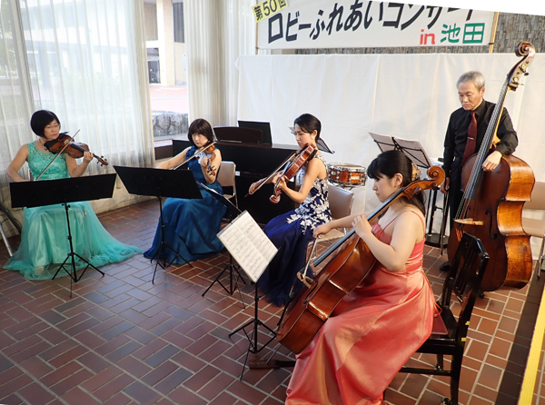 会場の入り口には、プロジェクターとスクリーンを設置し、49回分のコンサートの画像を大きく映し出しました。なんと12時半頃からお客様が来はじめ、最終的には過去最高の160人越えでうれしい悲鳴! 椅子をどんどん追加しましたが追いつかず、ついに階段にまでひとがあふれていきました。 皆も良く知る ヨハン・シュトラウス2世の“ウィーンの森の物語”から始まり、モーツァルト“メヌエット”、シューベルトの“ます”と、曲の解説を入れながら軽やかな舞曲が演奏されていきます。 そのご、演奏者と楽器の紹介を兼ねて、その楽器の個性が分かる曲の一節をそれぞれ披露してくださいました。ブラームスの“ハンガリー舞曲第6番”を演奏したところで15分間の休憩。
