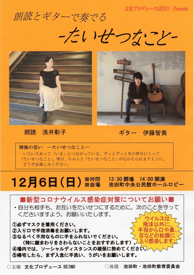 年の瀬も押し迫る12月6日、朗読の浅井彰子さん、ギタリストの伊藤智美さんをお迎えし、「朗読とギターで奏でる たいせつなこと」の実施にこぎ着けました。出演をお引き受け下さったお二人にもさまざまお気遣いをいただき、本当に感謝の念に堪えません。 開催に向け、スタッフは万全のウイルス対策を検討しました。定員を定め、事前予約制とし、チラシも紙面の半分近くを注意書きに費やしました。第3派と呼ばれる感染症拡大が押し寄せてきて、不安は増すばかりです。手指消毒液、測温計、マスク、除菌ティッシュ… 当日プログラムも表紙に大きく注意書きを記載させていただきました。