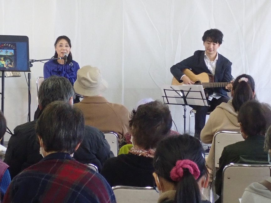 開催日は12月5日(日)、場所は中央公民館2階の第1会議室。定員100人の部屋ですが、コロナ対策により収容50人まで、となっているこの部屋を催事会場に選びました。出演は先年好評を博した朗読の浅井彰子さん、ギタリストの伊藤智美さんお二人のユニットにお願いしました。 前日に助っ人を頼んで1階から重い道具類を上げて、何とか会場設営。本番当日も何かと至らないところがあり、出演をお引き受け下さったお二人には本当に申し訳ない気持ちでした。 開催に向け、スタッフは万全のウイルス対策を検討しました。定員を定めた事前予約制とし、手指消毒液、測温計、マスク、除菌ティッシュ… 当日プログラムも表紙に大きく注意書きを記載させていただきました。